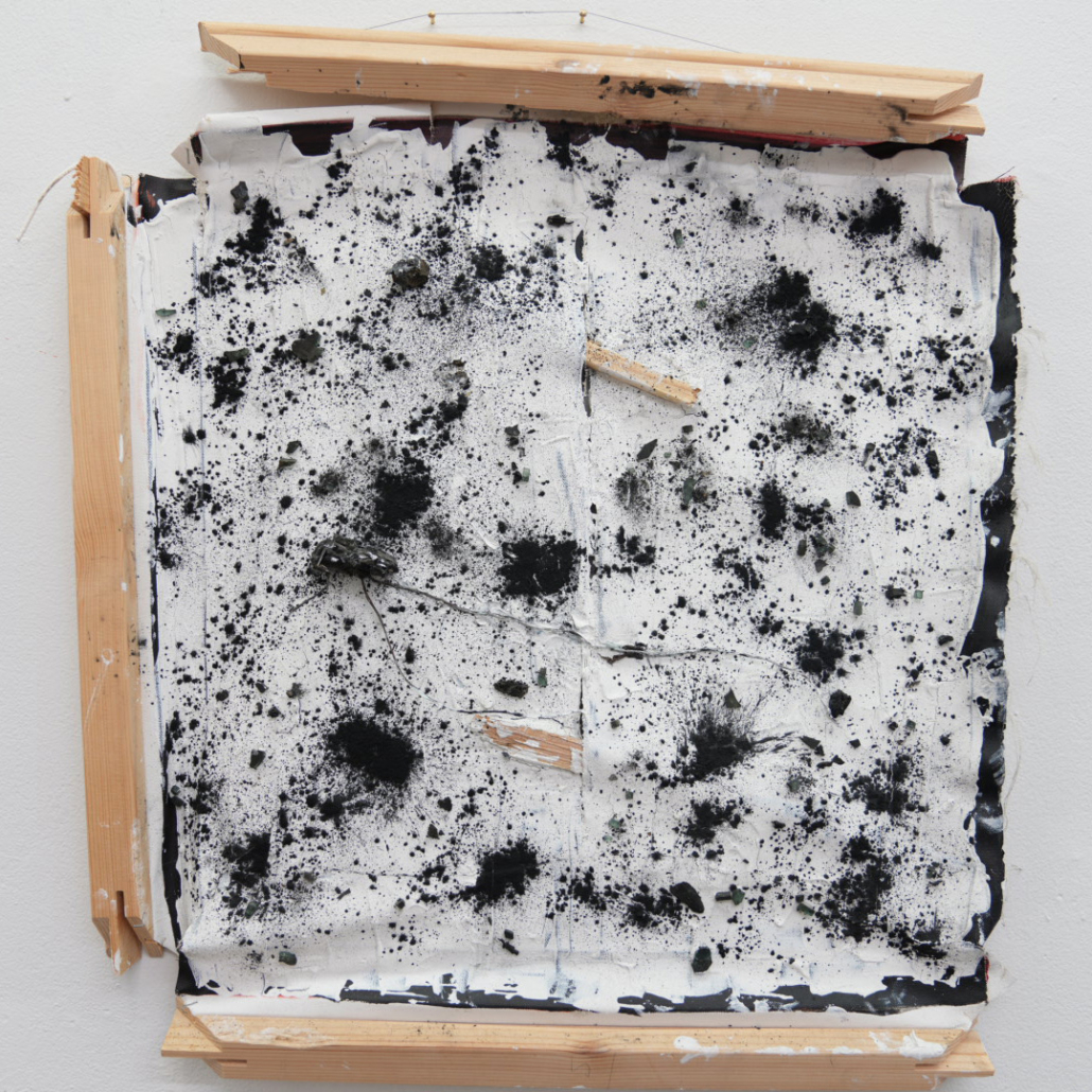 Materials: Acrylic, acrylic-plaster mix, fine art charcoal pigment, burnt car parts, and burnt glass on canvas