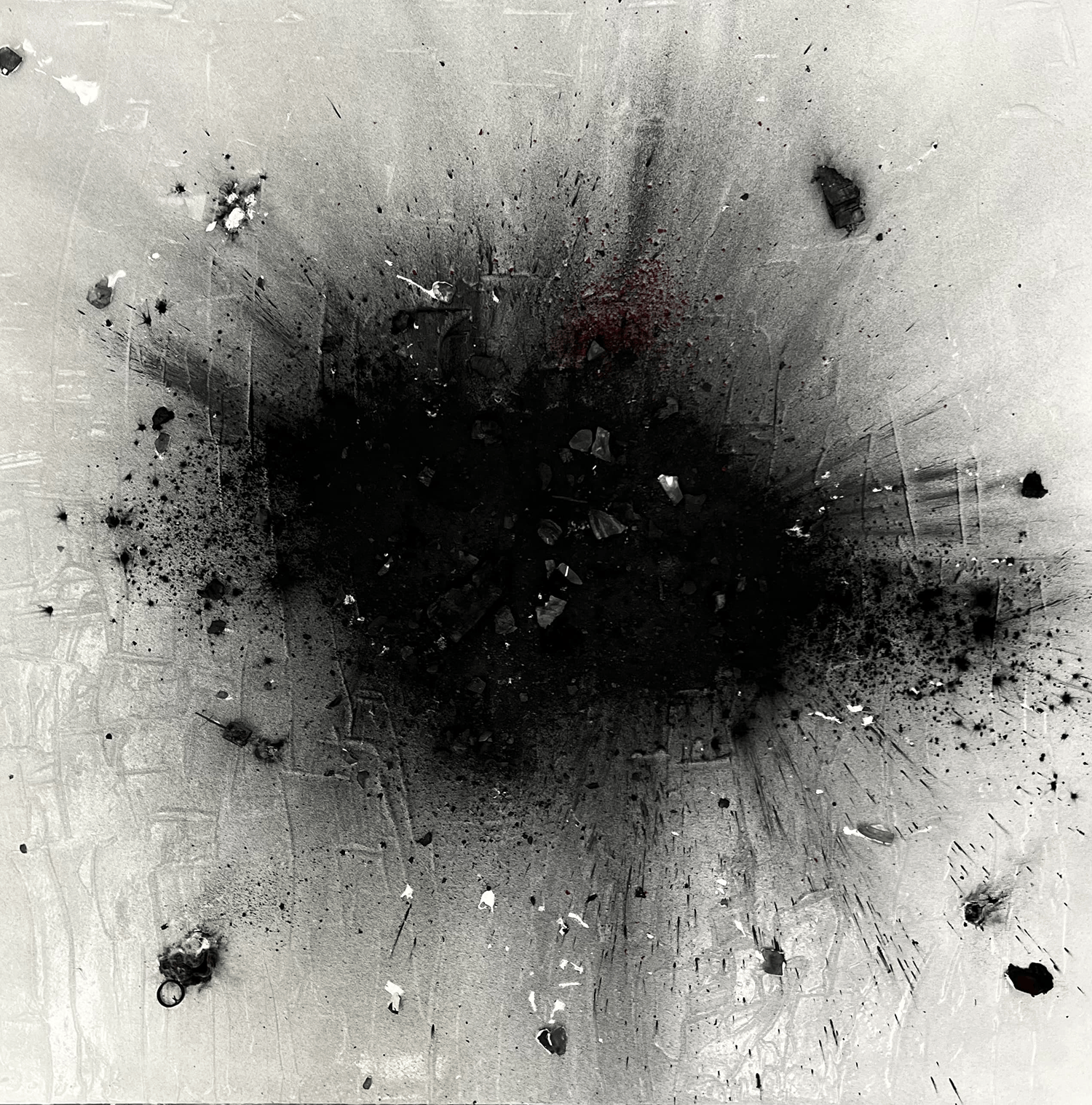 Materials: Acrylic paint, acrylic-plaster mix, crushed red and blue chalk, mix of organic and fine art charcoal pigments, charcoal pieces, burnt car pieces, and burnt glass on drywall
