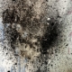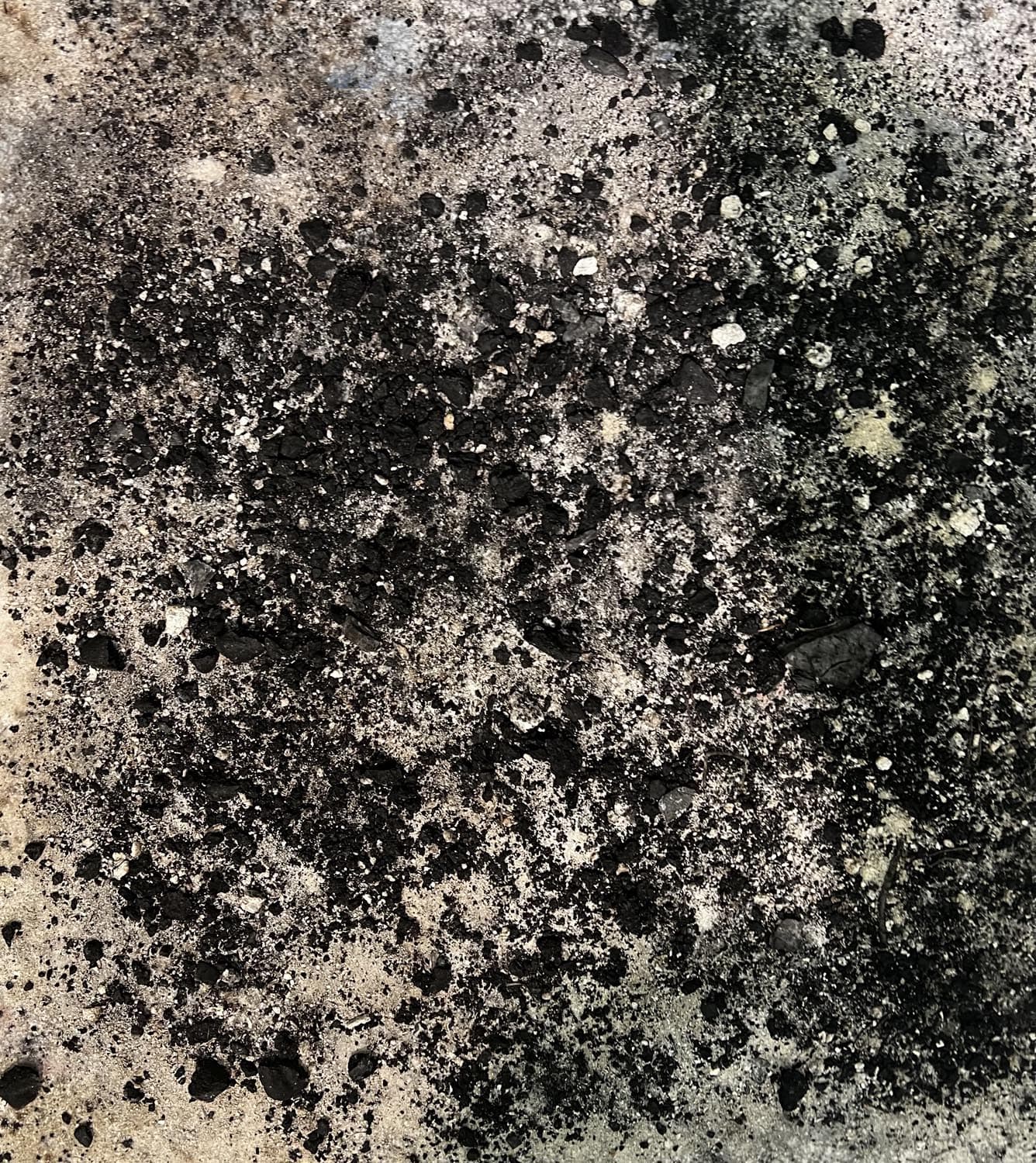 Materials: Burnt and set to natural elements. Acrylic, plaster-acrylic mix, crushed coal, mix of organic and fine art charcoal pigments, ash, and broken glass on drywall