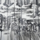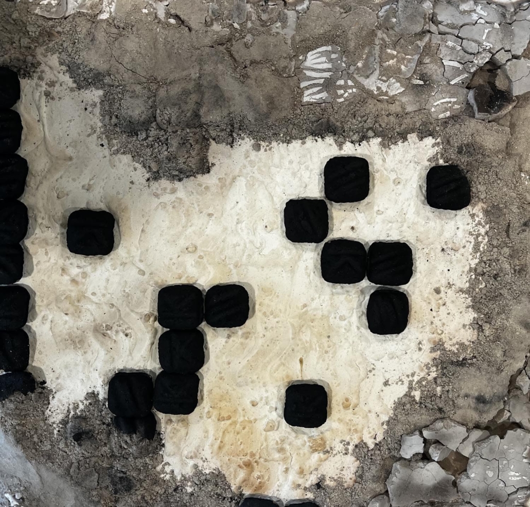 Materials: Burnt and set to natural elements. Acrylic, plaster-acrylic mix, crushed coal, mix of organic and fine art charcoal pigments, ash, and broken glass on drywall
