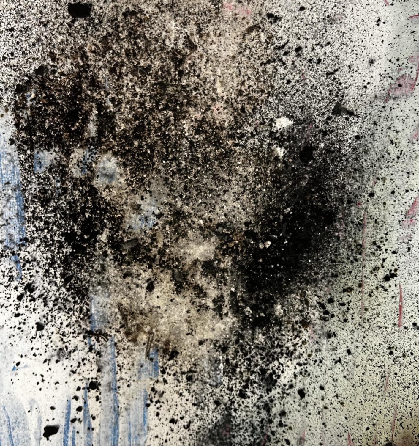 Materials: Burnt and set to natural elements. Acrylic, plaster-acrylic mix, crushed coal, mix of organic and fine art charcoal pigments, ash, and broken glass on drywall