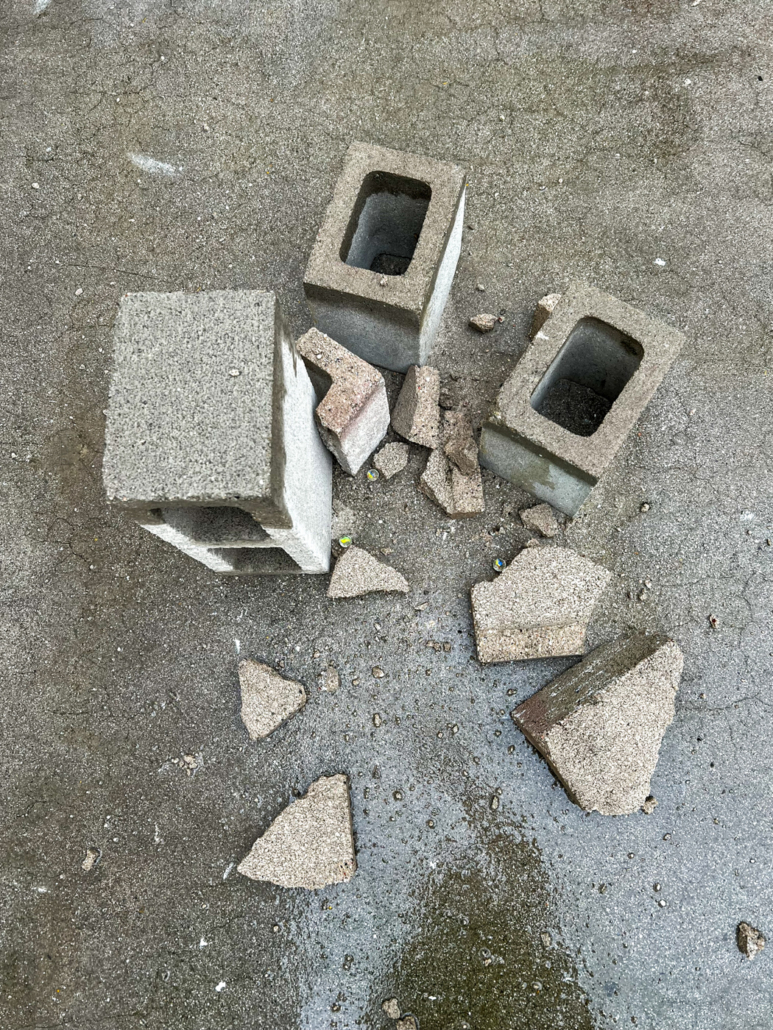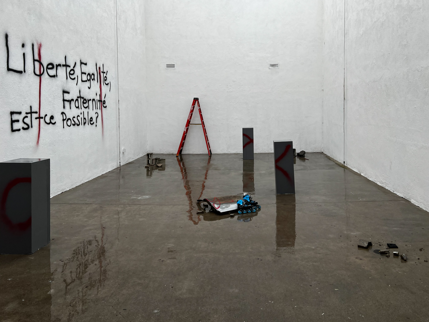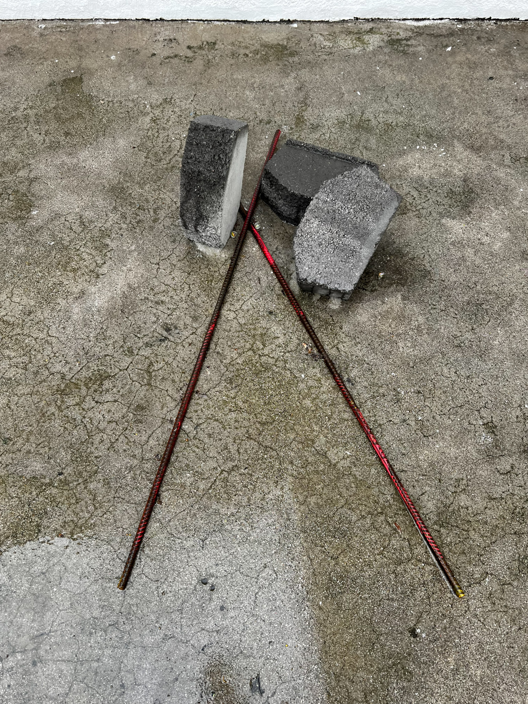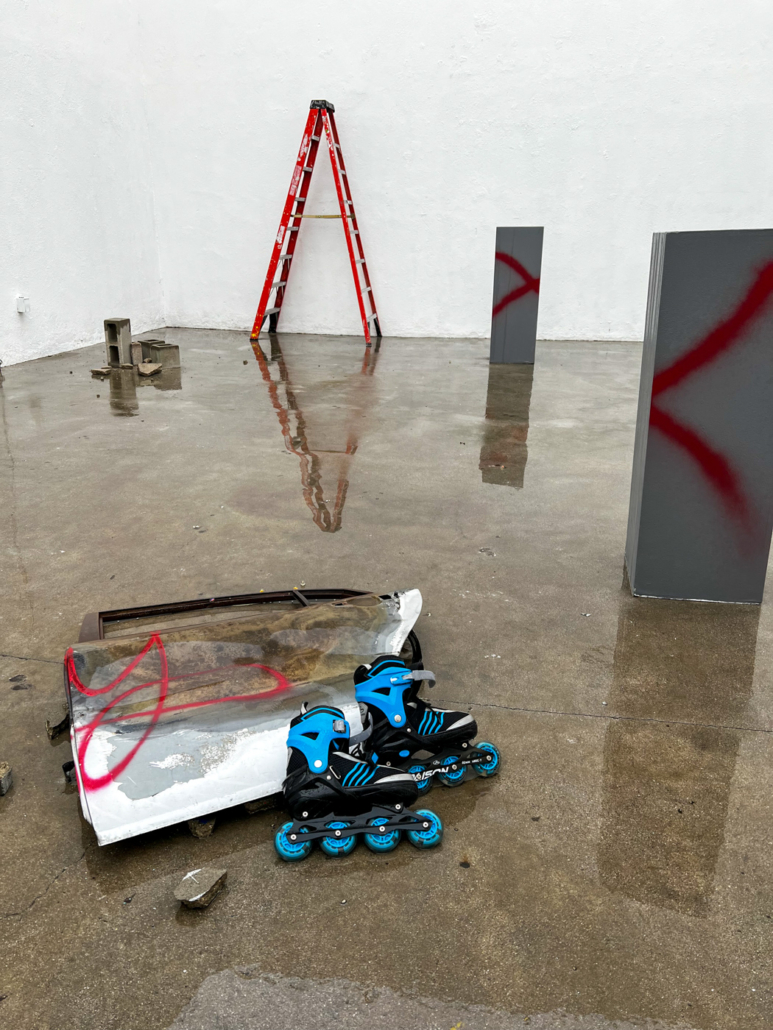 Materials: Spray painted wall, painted pedastals, latter, fire damaged car door, marbles, concrete blocks, "blue chair blue" roller blades, and rebar.