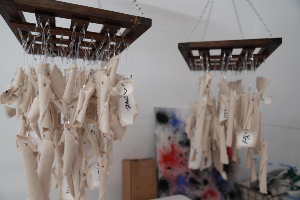 Materials: Reclaimed wood, canvas fabric, acrylic, liquid charcoal, hooks, and fishing wire